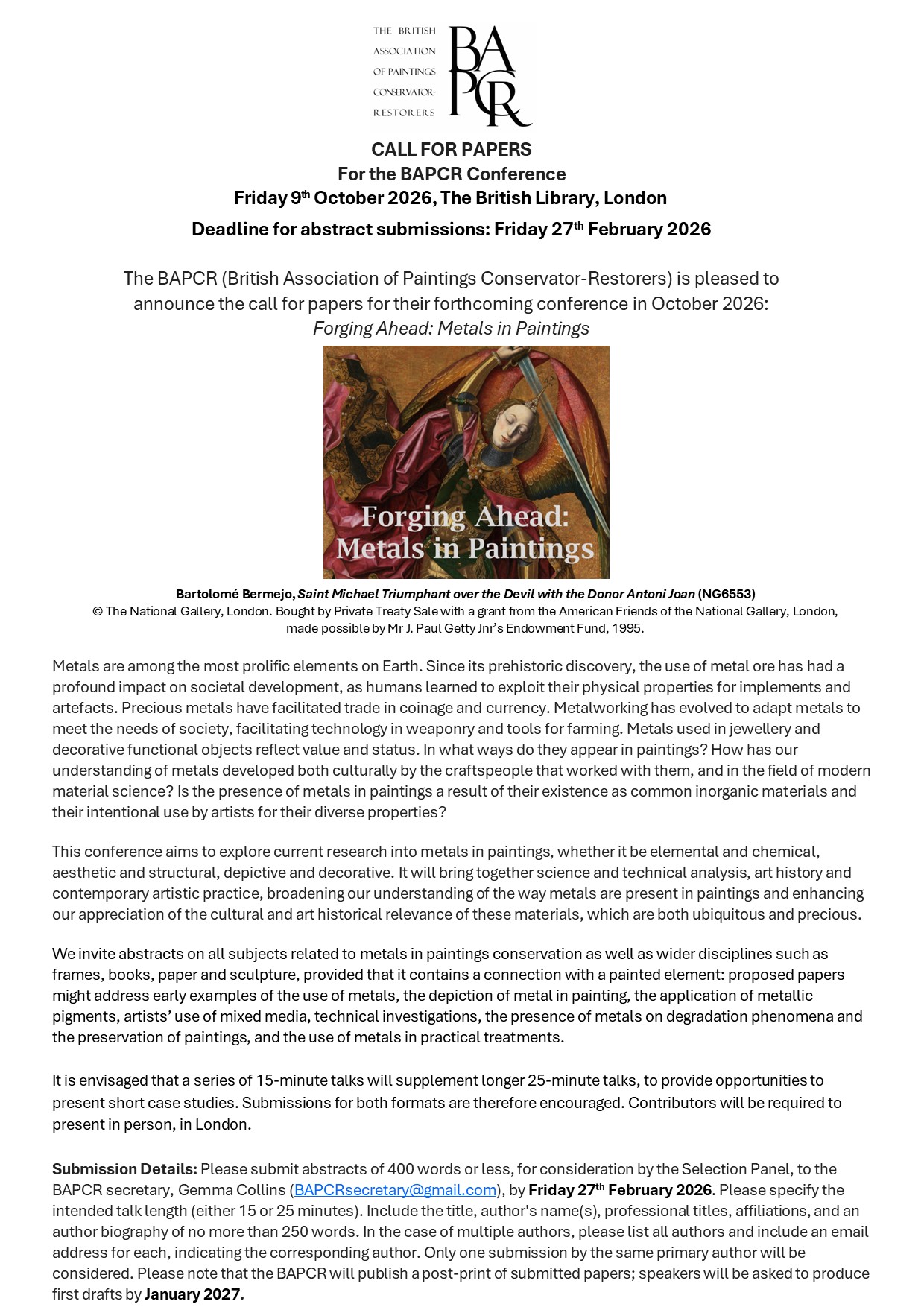 The BAPCR (British Association of Paintings Conservator-Restorers) is pleased to announce the call for papers for their forthcoming conference:
